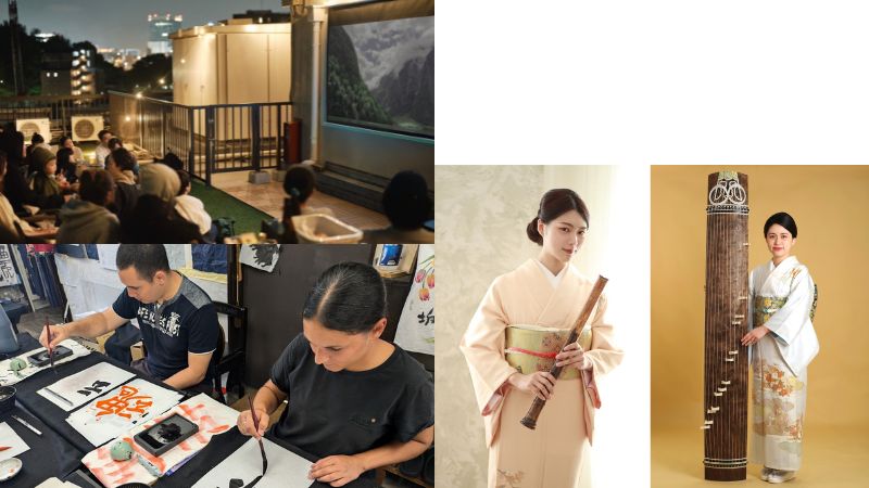 There’s something for everyone at this event, from kids to grandparents. Alongside live koto and shakuhachi performances, the lineup includes kamishibai (picture-card storytelling), calligraphy workshops, traditional fan-making, a rooftop festival, and Rooftop Movie Night — an outdoor screening under the open sky.