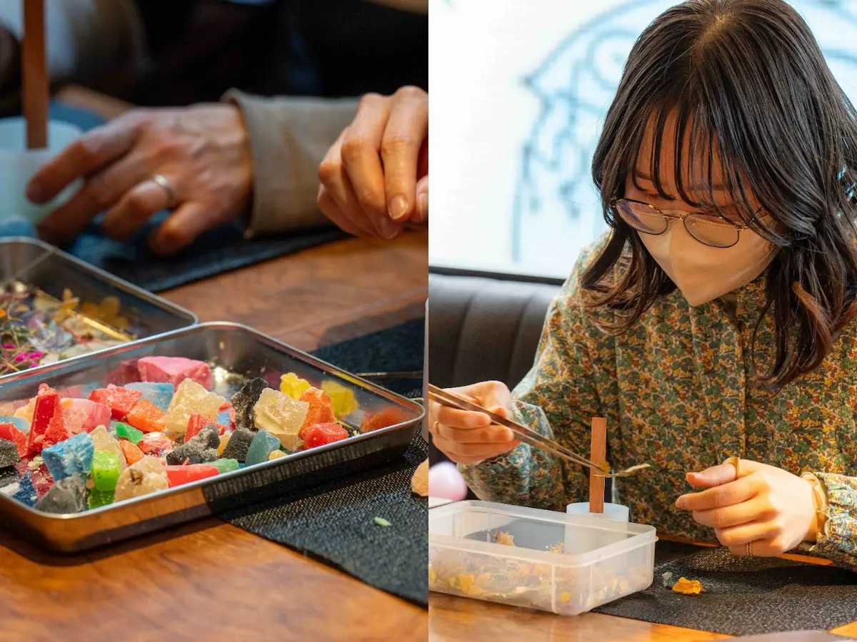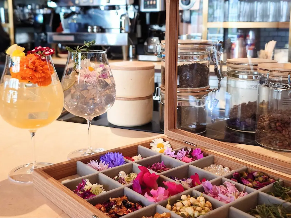 An original drink made with a cordial syrup base. Guests could customize their drink by choosing edible flowers, herbs, and dried fruits, before finishing it with a delicate floral scent spray.