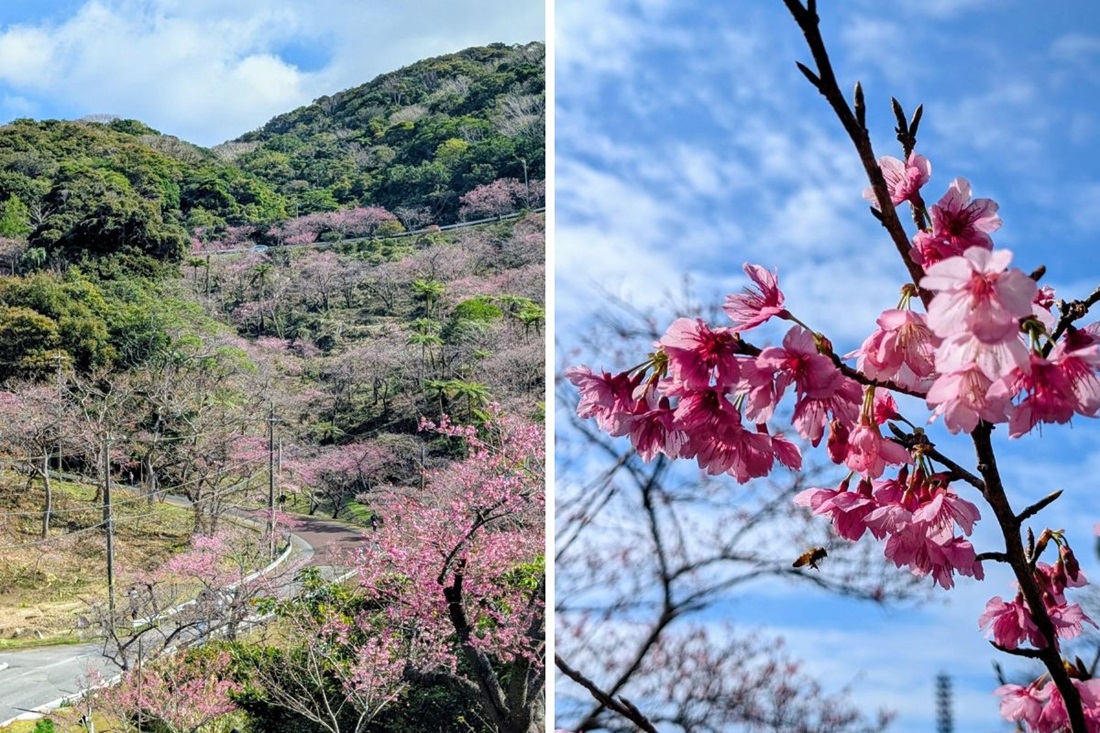 約7,000本のカンヒザクラが咲き誇る標高453mの山道をドライブ。