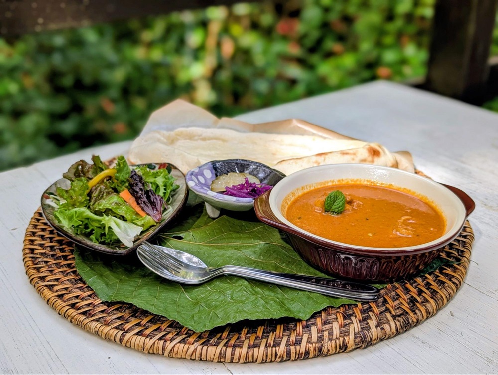 スパイスの香りと程よい辛さの中に甘さを感じる、どこか優しい味わい。石窯で焼いたパリパリ・もちもちの大きなナンとの相性もぴったりで、最後の一口まで夢中で食べてしまいました。 鳥の声を聞きながら、緑溢れる空間でおいしいご飯をいただく。心から癒される贅沢な時間を過ごすことができました。