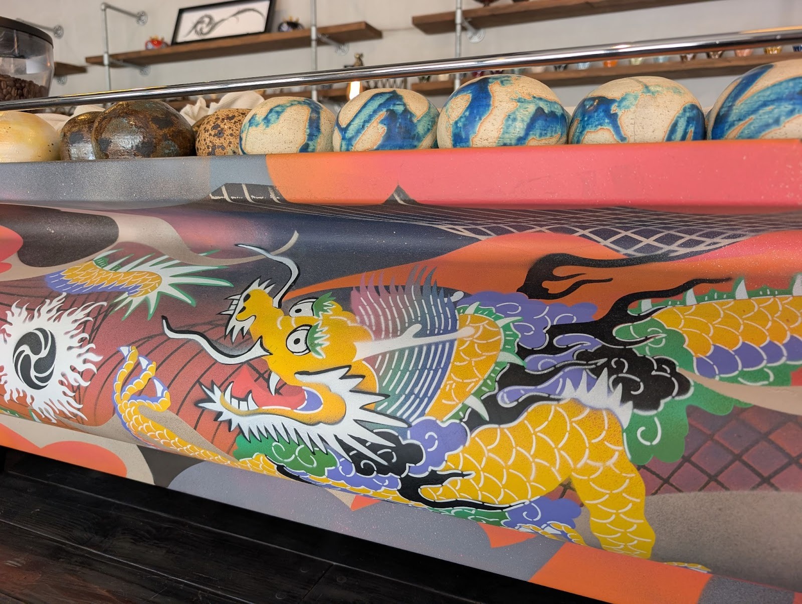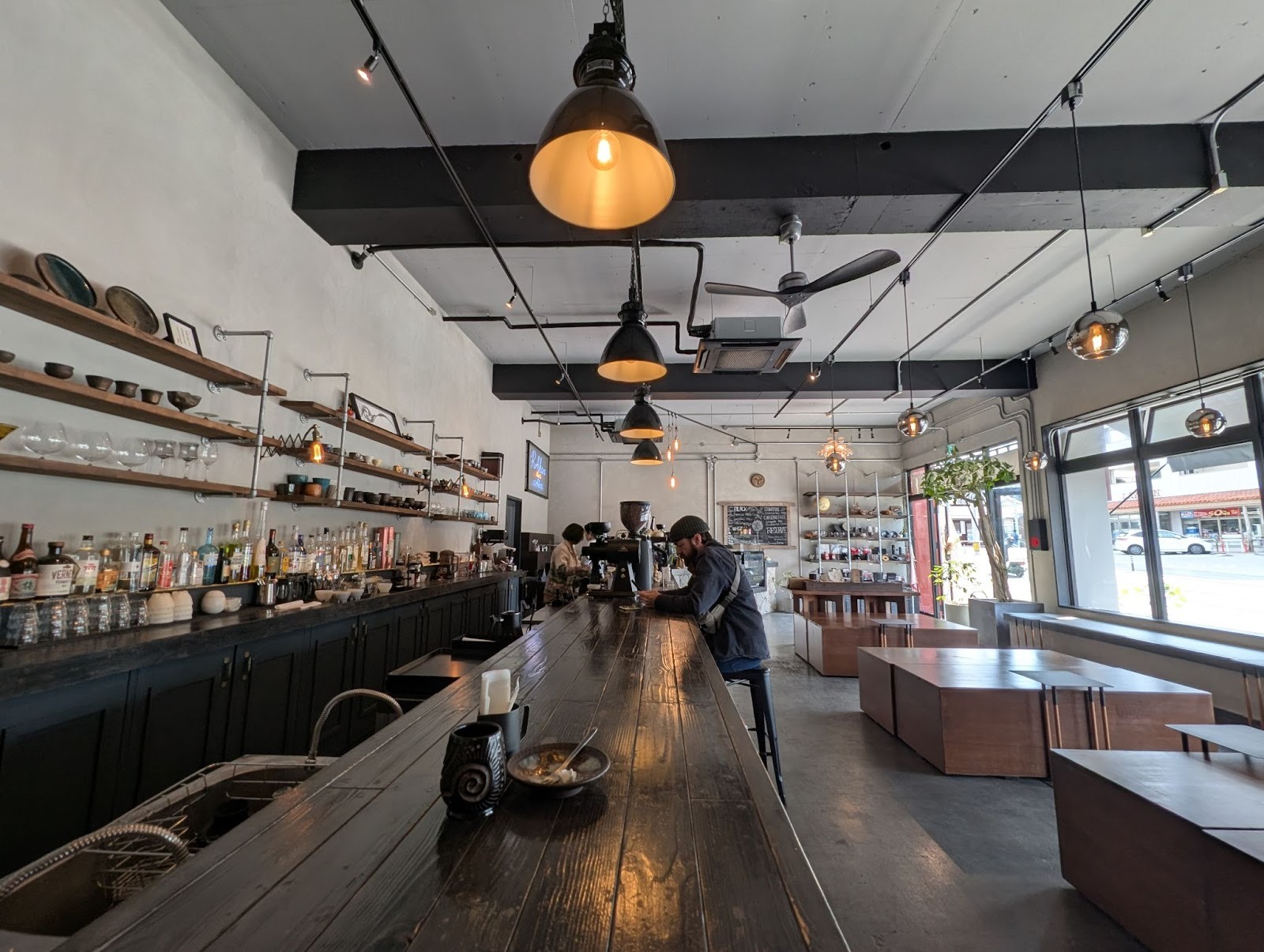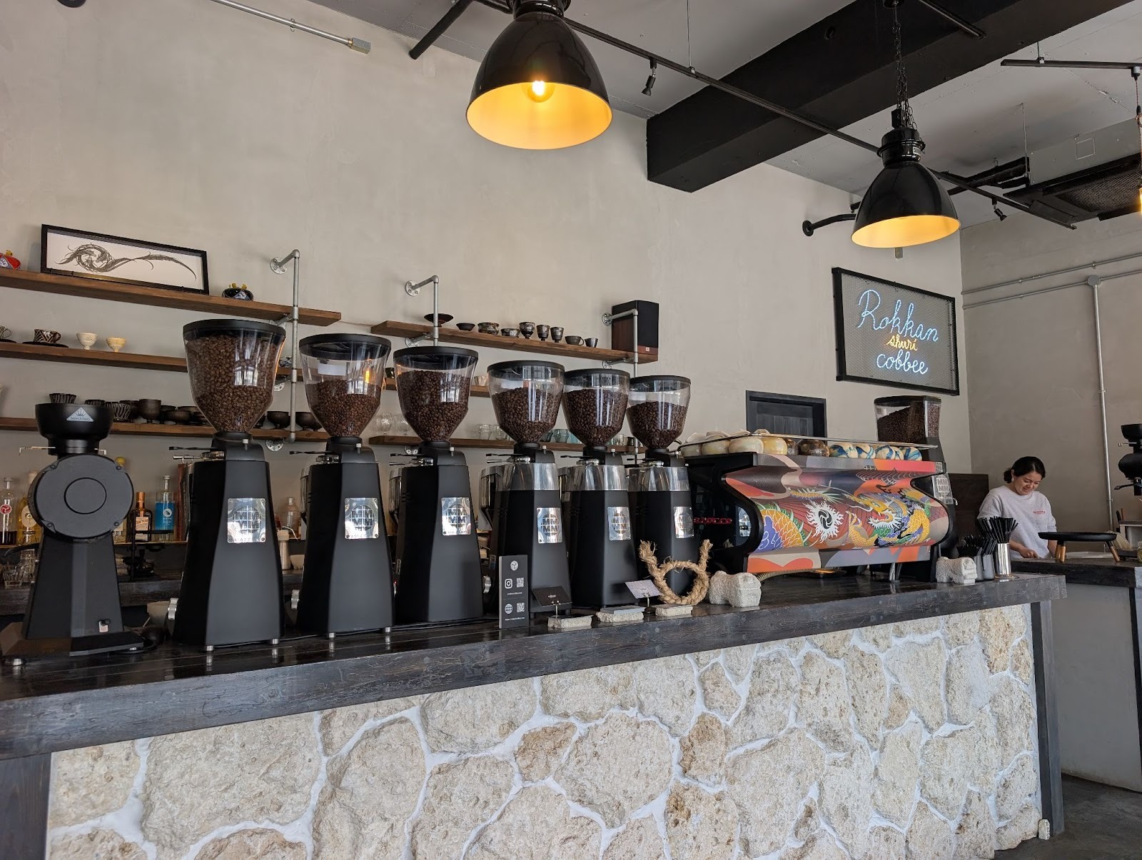 店内には琉球石灰岩のカウンターや、龍が描かれたエスプレッソマシンなど、沖縄の伝統を感じる意匠が随所に散りばめられています。あえてテーブルを置かず、カウンターやベンチをゆったりと配置した空間には、地元の常連さんも多く訪れるアットホームな時間が流れています。