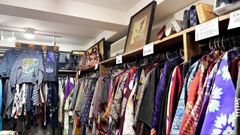 店内には着物がずらりと並びますが、魅力はそれだけではありません。リサイクル着物やアンティーク着物、着物のリメイク品、骨董品、現代彫刻まで、幅広いアイテムがそろっています。