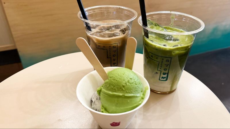 看板メニューの抹茶ラテ(¥750)は、濃厚で深みがありながら甘さ控えめ。