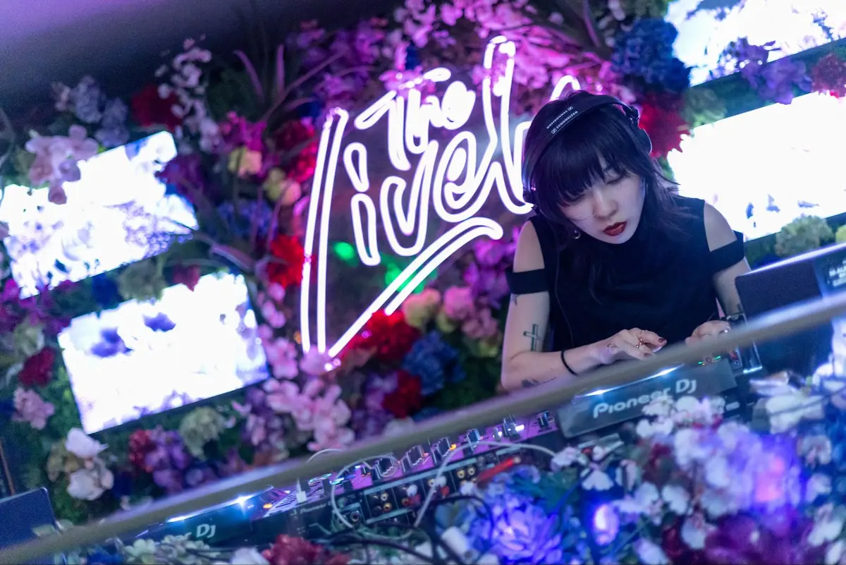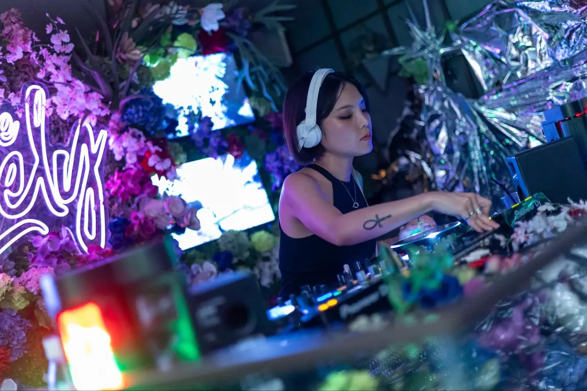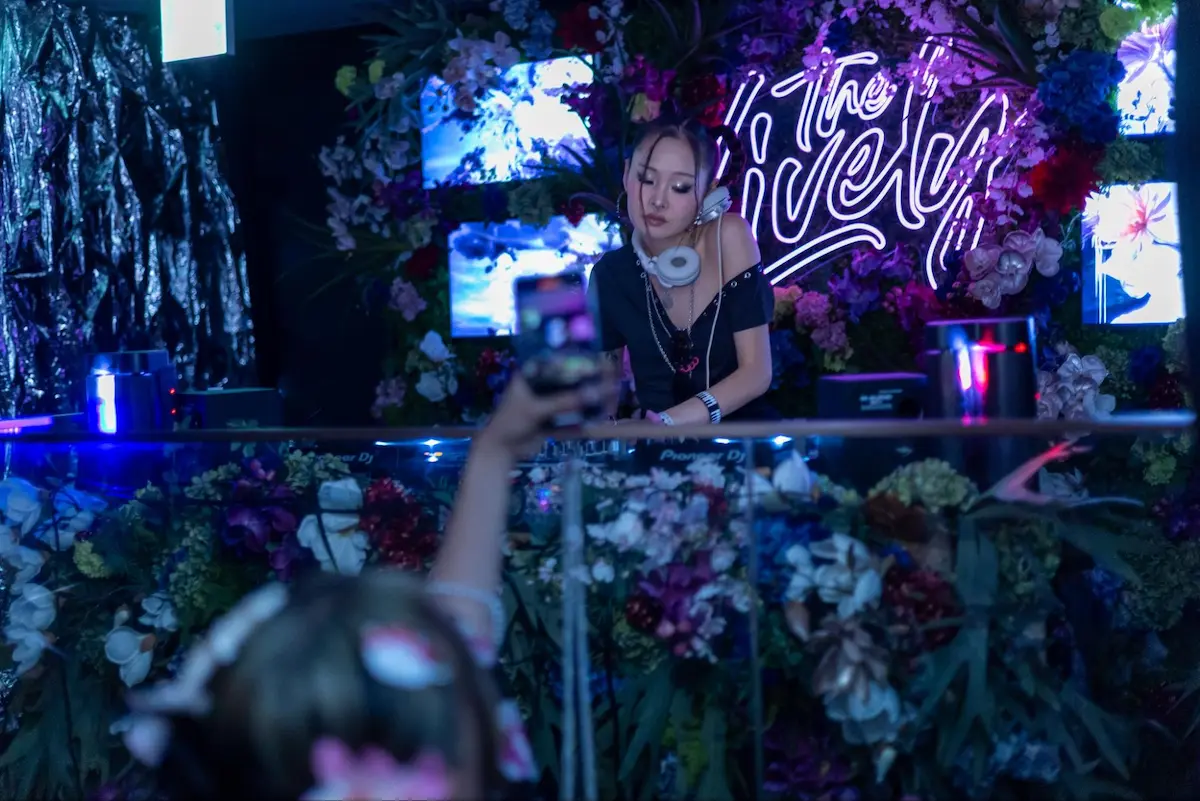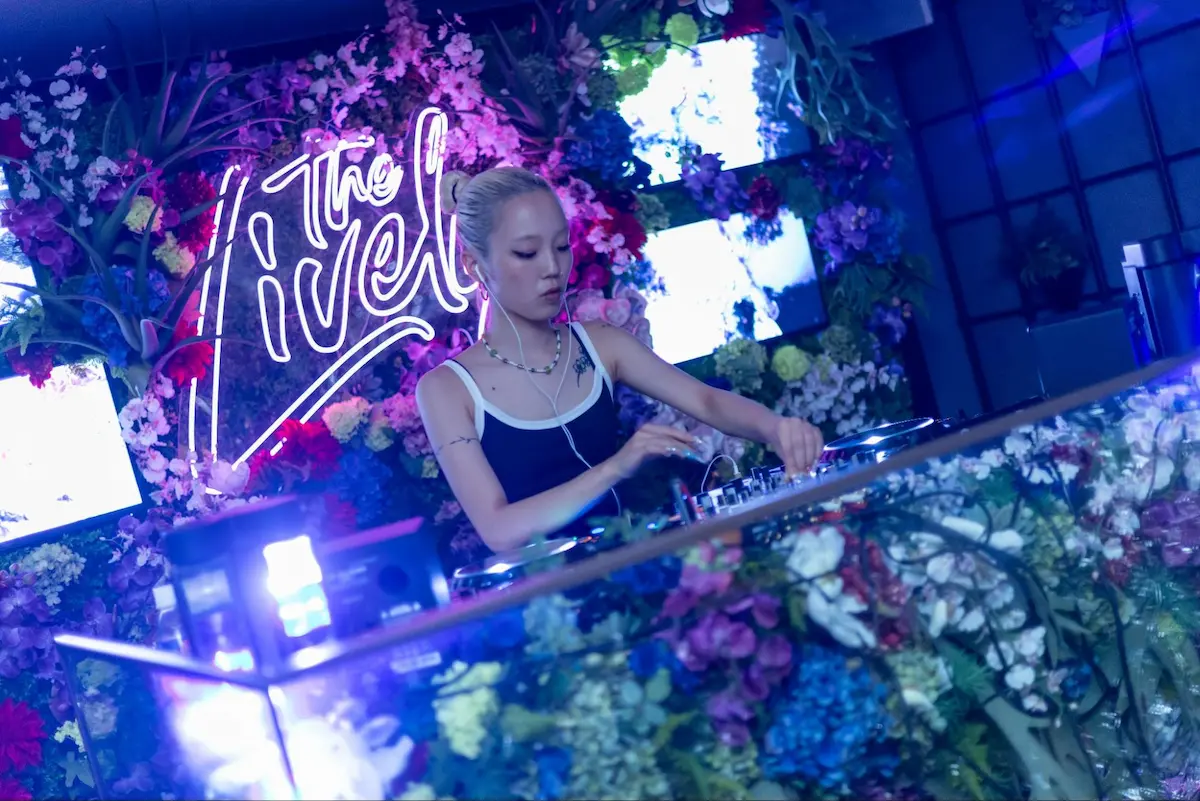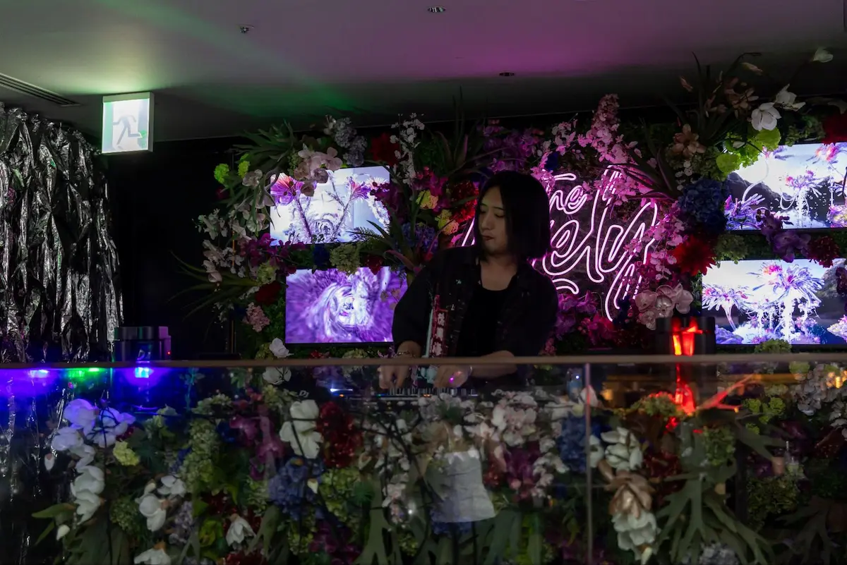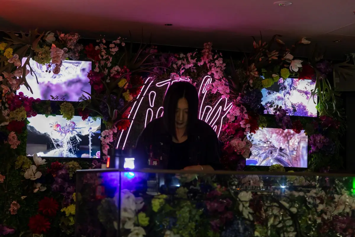 大阪を拠点に活動するグラフィックデザイナーCoco Nishiのキービジュアルをはじめ、DJブースのバックパネルや階段のサイネージはGENERATIVE ART STUDIO inc.のオリジナルアート動画も投影。音楽とアートが連動することで、Y3Kの世界観をより立体的に体感できる空間が完成しました。