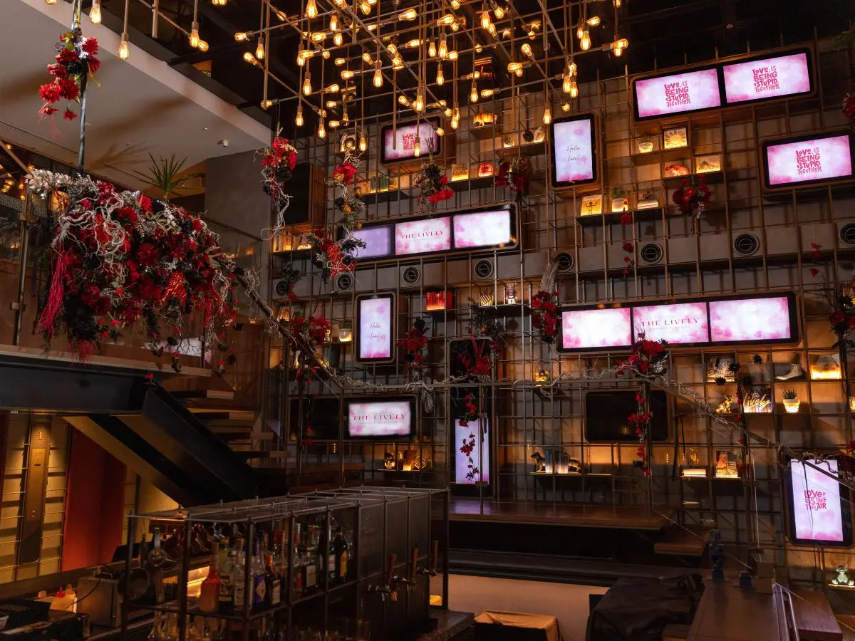 レッドやボルドーを基調に、ブラックやグレーのアクセントを添えた、華やかでありながらも甘すぎない配色の花々で飾られており、照明やサイネージディスプレイとの融合も見どころです。THE LIVELY 福岡博多ならではの洗練された世界観をご体感ください。
