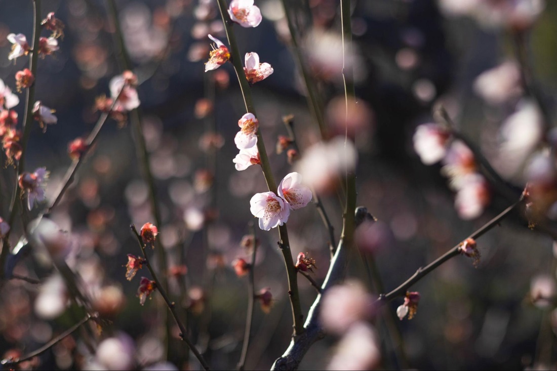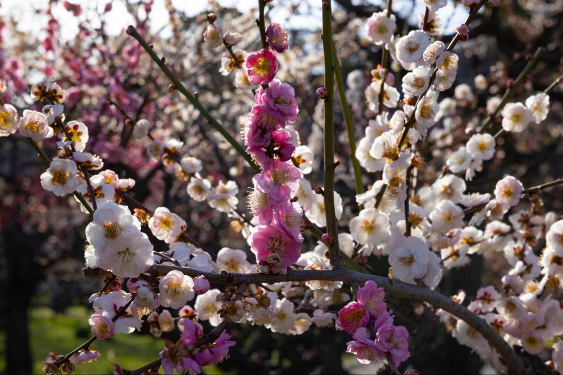 毎年2月上旬から3月中旬頃まで梅の花が見頃を迎え、白梅や紅梅などさまざまな色の梅の花が咲き誇り、春の訪れを感じさせてくれる美しい景色を楽しむことができます。