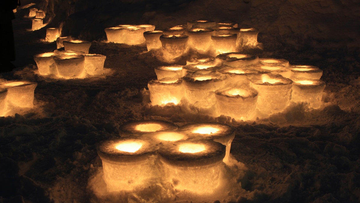 雪の上に並ぶあかりに加え、